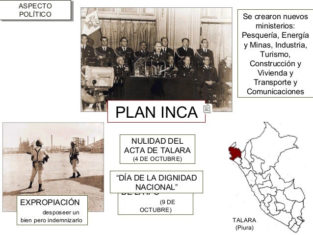 El 3 de Octubre de 1968, cuando Fernando Belaúnde Terry seguía al mando, ocurre un escándalo mediático, el Acta de Talara y la página 11. En este contrato se encontraba una página en blanco, sin firmar, precisamente la página 11. Velasco Alvarado aprovecha esta situación en el país y efectúa un golpe de estado con este escándalo como excusa. Coincidentemente, Juan Velasco Alvarado era jefe de las Fuerzas Armadas del Perú, adicionalmente este poseía creencias socialistas y nacionalistas, al estilo soviético. Su plan de gobierno se llamaba el “Plan Inca”. Fue una dictadura militar reformista que tenía como objetivo acabar con la oligarquía y promover el desarrollo nacional para evitar conflictos sociales. Su gobierno se caracteriza por las radicales reformas que realizó a cambio de lograr sus objetivos. Se estatizaron diversas empresas extranjeras; se impuso la reforma agraria: las haciendas de la oligarquía pasaron a posesión de los campesinos; se busco generar una industria nacional; se realizó la Reforma Educativa, etc. En lo mediático, se expropiaron algunos canales de televisión, así cómo también se confiscaron diarios o periódicos. Se pensaba en el gobierno que el desarrollo nacional garantizaría una seguridad interna y externa. Durante este gobierno se restablecieron las relaciones con Cuba y se estableció el sistema de Defensa Civil. También se realizó la renovación de material bélico, ya que existía una especulación de una próxima guerra con Chile. En los últimos años, se vieron los resultados del gobierno: la Reforma Agraria fracasó debido a la falta de asistencia técnica y económica, cayeron las exportaciones, se acentuó la dependencia extranjera y se aumentó la deuda externa. En lo positivo, con estos cambios, se dignificó a la población indígena, quien comenzó a tener cada vez más participación en la vida política y social del país.
